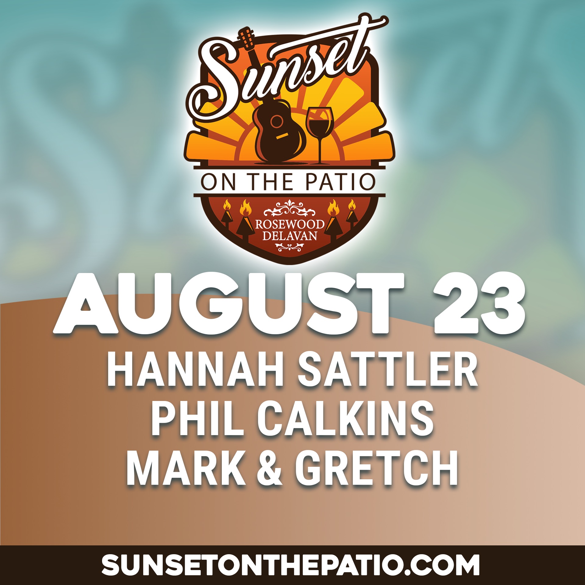 Sunset on the Patio – August 23, 2026. Hannah Sattler / Phil Calkins / Mark & Gretch. 5-9PM | Rain or Shine.